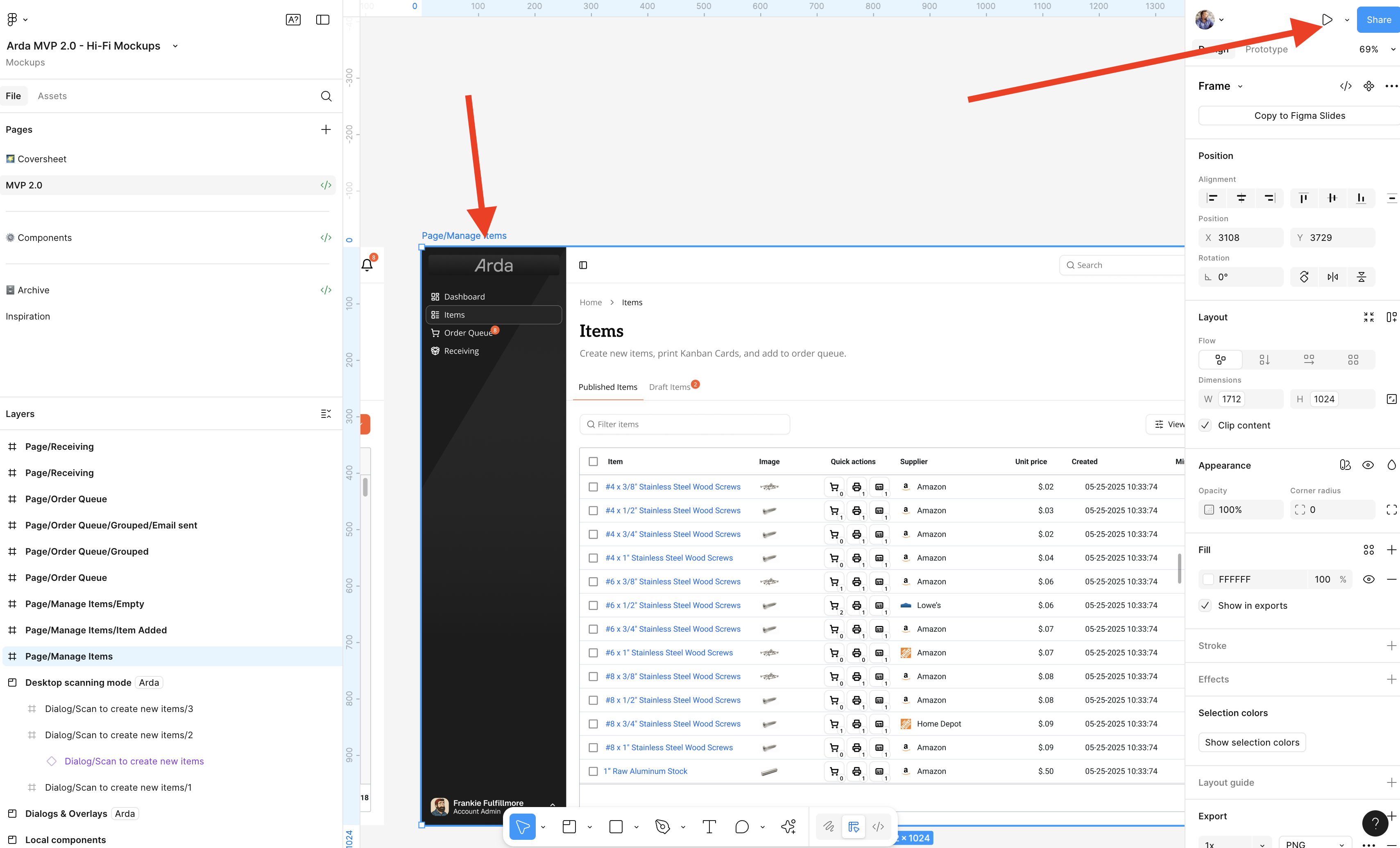To enter prototype mode for any page, select the “Frame” of the page, then click the play button in the top-right: