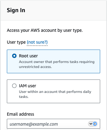 Go to the AWS Root Login page and Select the Root User option. Enter the credentials or have 1Password fill them in for you.
